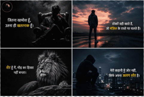 Attitude Shayari for Boys in Hindi यह सब स्टाइलिश तरीके से कॉन्फिडेंस, ताकत और बिना डरे सोच दिखाने के बारे में है 😎🔥। यह दिखाता है कि लड़के बिना ज़्यादा कुछ कहे अपनी पर्सनैलिटी कैसे दिखाते हैं, छोटी और दमदार लाइनों का इस्तेमाल करके जो गहरा असर डालती हैं। ये शायरी WhatsApp स्टेटस, Instagram कैप्शन और Facebook पोस्ट पर स्वैग और सेल्फ रिस्पेक्ट दिखाने के लिए बहुत ज़्यादा इस्तेमाल होती हैं।